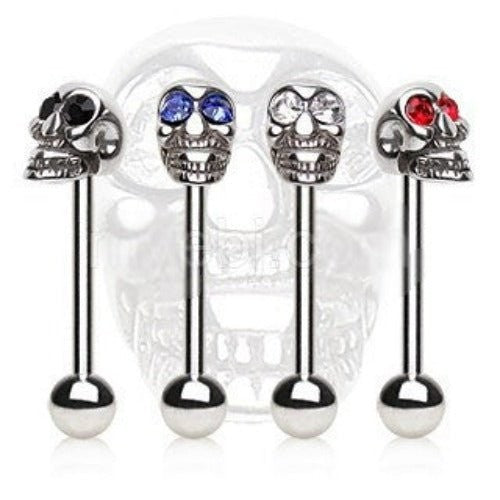 316L Surgical Steel Barbell with One Gemmed Skull. Slick Surgical Steel Barbell With a Detachable Hard Skull With Gem Eyes and One Detachable Ball.