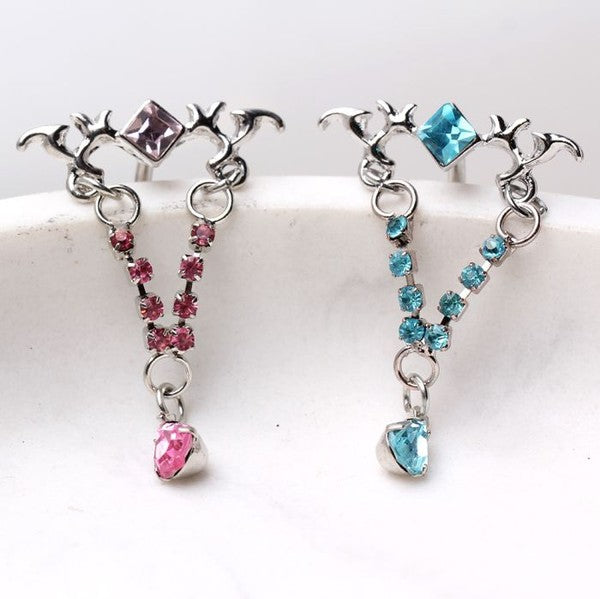 316L Surgical Steel Gemmed Tribal Chandelier Top Down Navel Ring Top Down Belly Rings are a break from the norm and this stunning Navel Ring pushes it even further with Bold design and sparkly colored CZ gems. An eye-catching piece this Chandelier style starts with a Tribal style flared top and large diamond-shaped faceted gem, a metallic chain of hoops and gems finish with a beautiful Teardrop-shaped Prong set Cubic Zirconium gem. Our Gemmed Tribal Chandelier Top Down Navel Ring is crafted out of high-quality 316L Surgical Steel and polished to a mirror finish.
