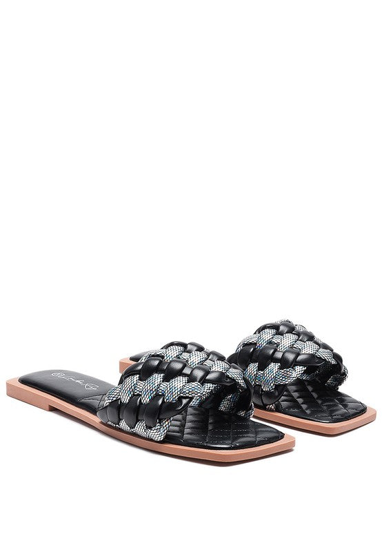 Square toe trendy slides with woven straps to secure feet well. Trendy pair of flats which are all in rage this summer.