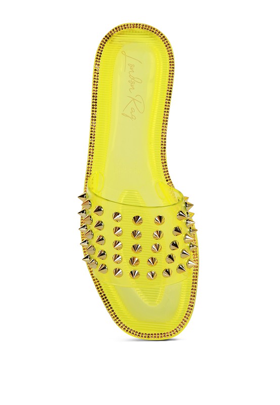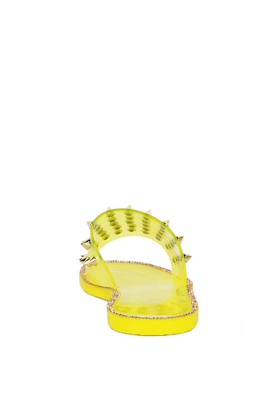 Water-resistant soft jelly flats with stylish punk pointed studs detail straps, the grooves rainy flats have a sparkling diamante outline which looks gorgeous on feet.
