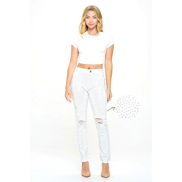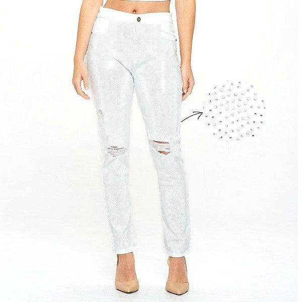- These white denim pants are a brilliant and chic addition to your wardrobe, featuring sexy rhinestone detailing for a touch of sparkle.