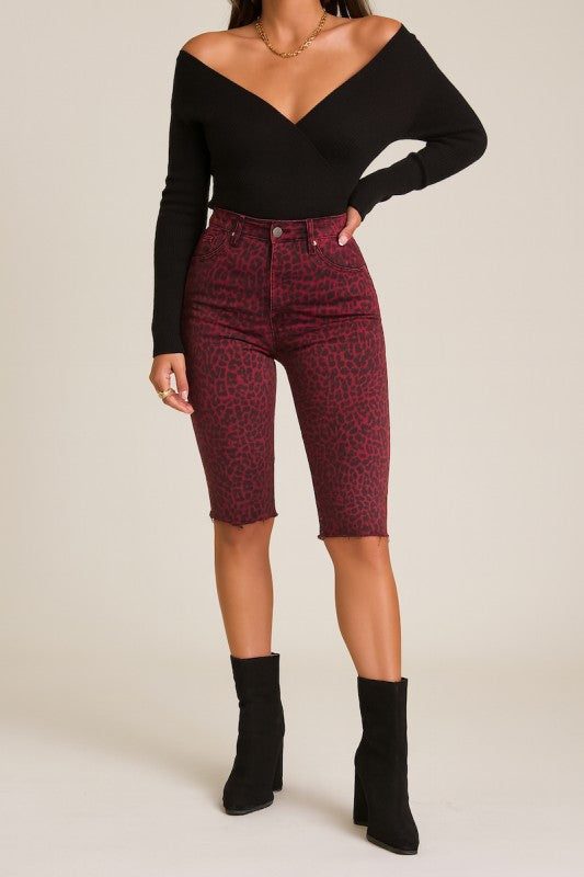 Turn heads in these statement-making high-rise capri shorts, designed in a rich burgundy leopard print on premium denim. Featuring a flattering slim fit, edgy raw frayed hem, and just the right amount of stretch for comfort, these shorts deliver the perfect mix of bold style and lasting quality. Pair them with boots or heels for a chic night-out look, or dress them down with sneakers for effortless street style.