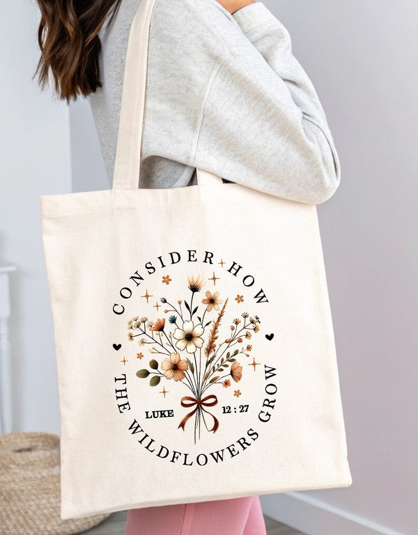 Our Consider How The Wildflowers Grow tote brings Luke 12:27 to life - simple, beautiful, and effortlessly full of faith.