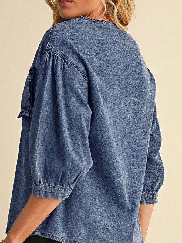 Cotton Denim Frilled Boho Pocket Top