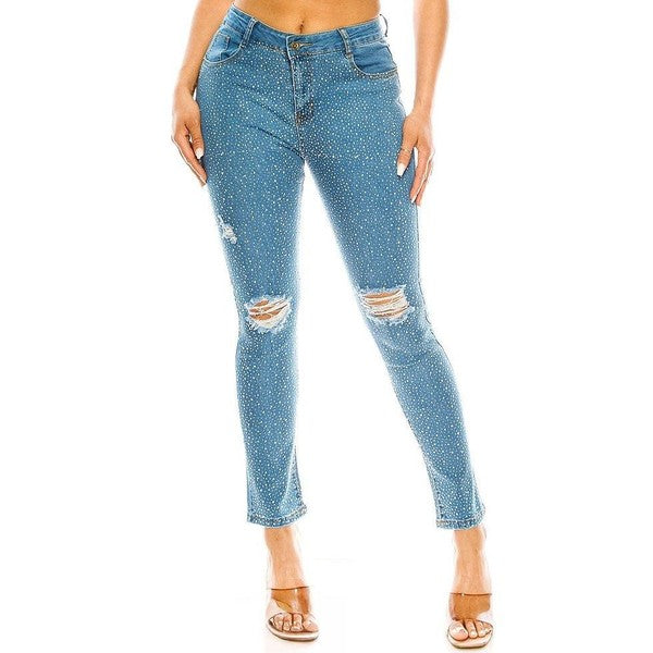 - Full Front cover Multi Size Tiny Chip rhinestone decorated Jean