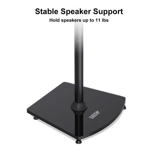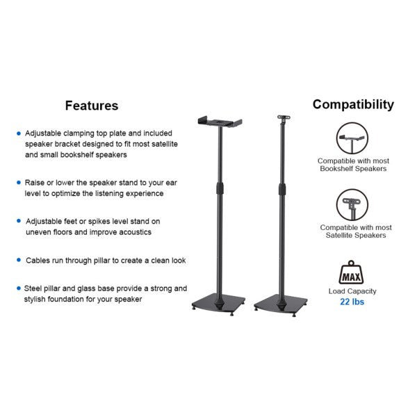 The ERSSM2-01B features an adjustable clamping top plate to securely hold small to medium bookshelf speakers. The included speaker bracket fits most satellite and small bookshelf speakers. Adjustable pillar raises or lowers the speaker stand to your ear level to optimize the listening experience. The adjustable feet or spikes level stand on uneven floors and improve acoustics. Built in cable management allows cables to run through the pillar to create a clean and finished look.
