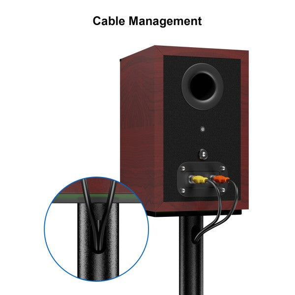 The ERSSL1-01B is designed to hold medium to large bookshelf speakers weighing up to 22 lbs. The adjustable feet or spikes level stand on uneven floors and improve acoustics. Built in cable management allows cables to run through the pillar to create a clean and finished look. Steel pillar and glass base provide a strong and stylish foundation for your speaker. 28\" height places the speaker at optimum listening level.