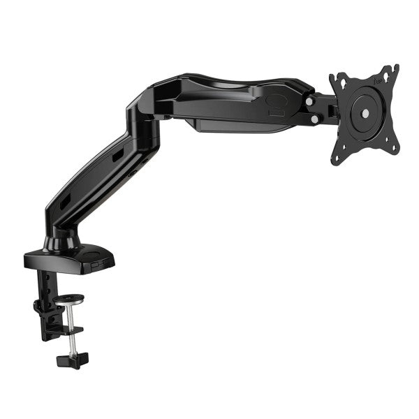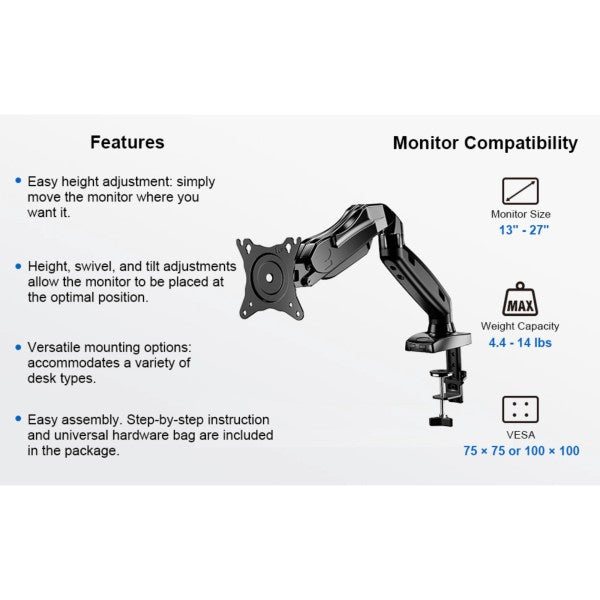 The ERDGS1-01B is a single monitor Desk Mount for Monitors 13-27\" weighing between 4.4 and 14 lbs. The gas spring arm provides easy height adjustment - simply move the monitor where you want it, no tools required! Height, swivel, and tilt adjustments allow the monitor to be placed at the optimal position. Versatile mounting options includes desk clamp, or grommet mount accommodates a variety of desk types.