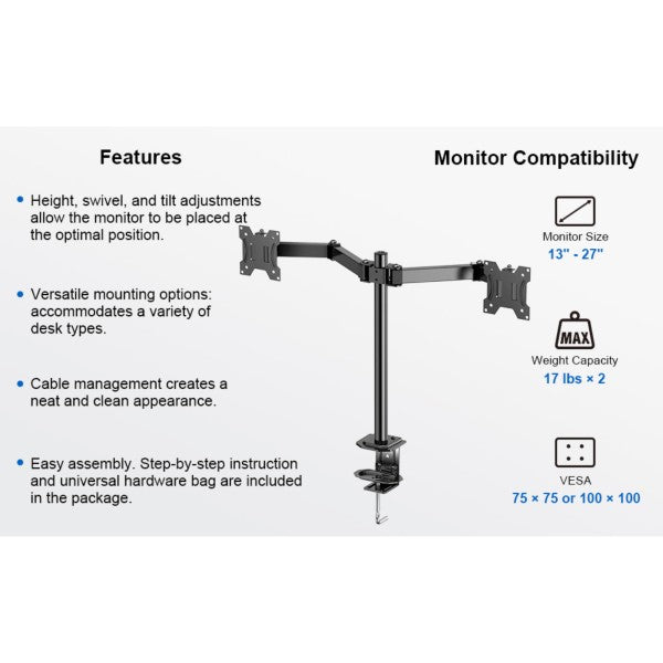- Universal compatibility - fits most monitors 13-27In and up to 17 lbs with VESA 75 x 75 or VESA 100 x 100 hole patterns