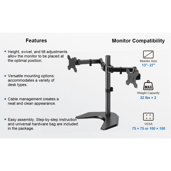 The ERDAS1-01B is a Motion Desk Mount for dual monitors 13-27 Inches and up to 22 lbs. Height, swivel, and tilt adjustments allow each monitor to be placed at the optimal position.