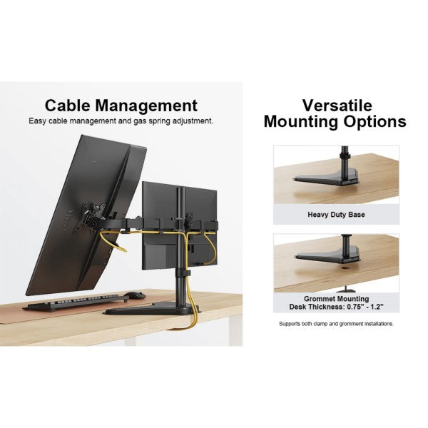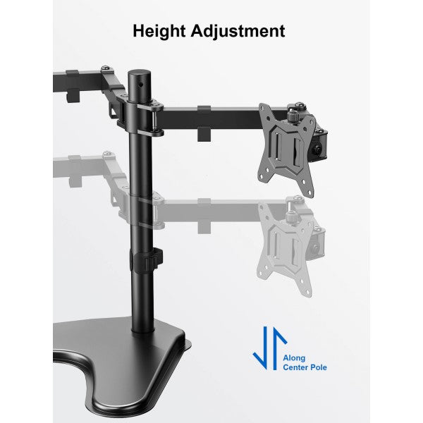 The ERDAM4-01B is a dual Monitor Desk Mount for monitors 13-32\" and up to 17 lbs. Height, swivel, and tilt adjustments allow the monitors to be placed at the optimal position. Versatile mounting options include heavy-duty base or grommet mount that accommodates a variety of desk types. The built-in cable management feature allows cables to be neatly organized creating a clean look.