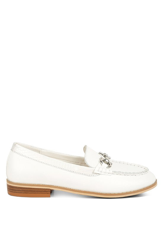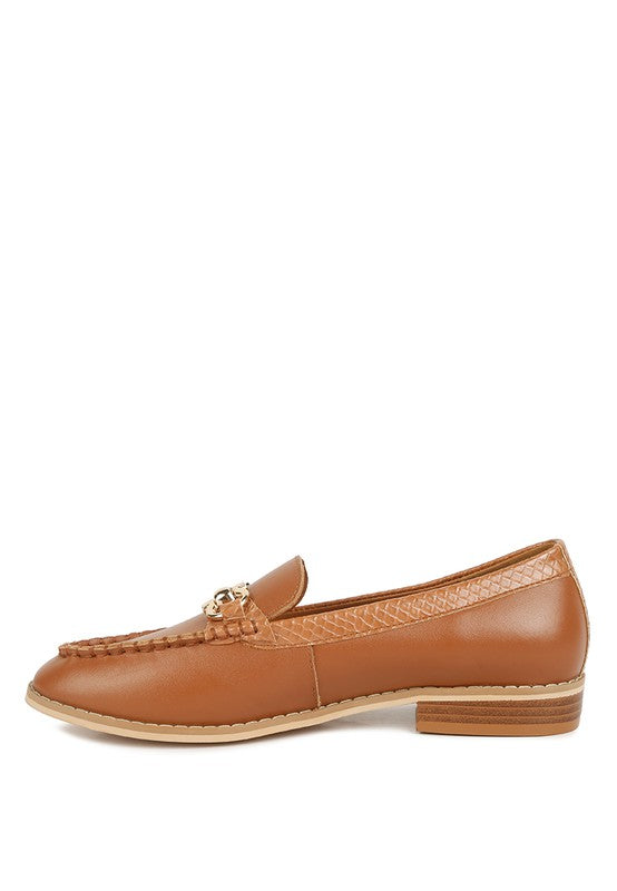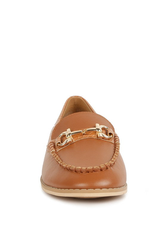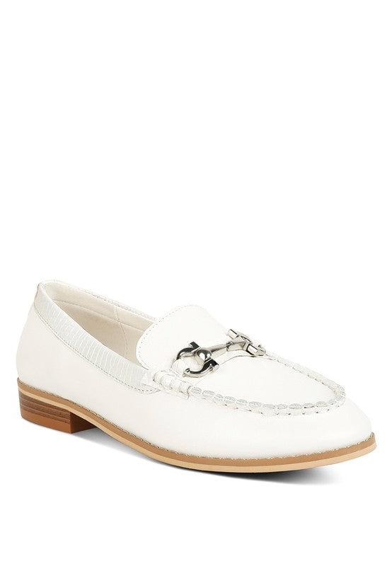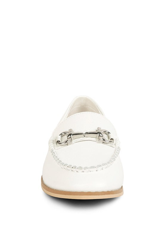 Vintage classic black loafers with flat heels and metallic horsebit emblishement. The mock stitch detail adds a modern dimension to the clasic favourite loafers.