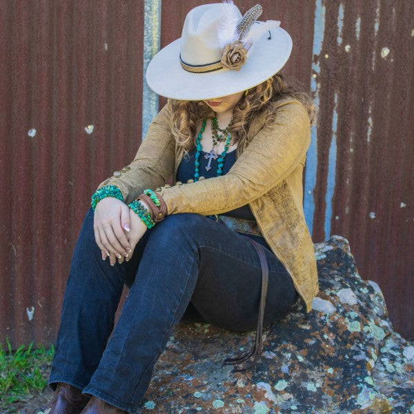 Elevate your style with our Dusty Leather Wide Cuff! Featuring large natural turquoise chunks, this unique accessory adds an effortless touch of chic to any outfit. Versatile and eye-catching, this cuff pairs perfectly with any look. Make a statement and stand out with our cuff!