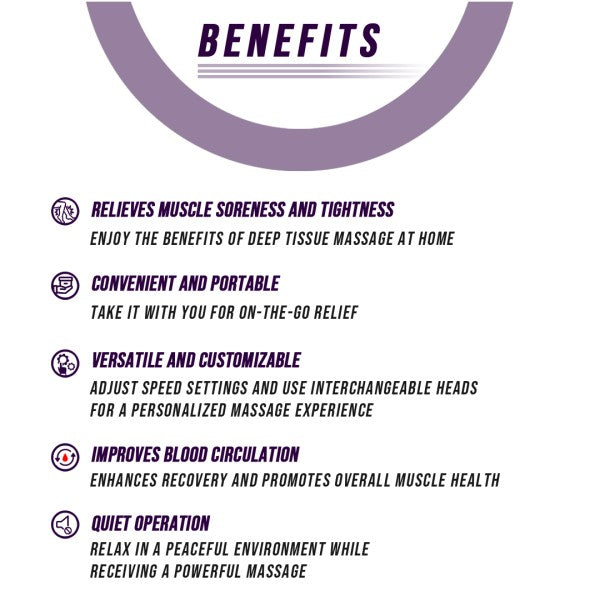 * Deep tissue massage: delivers powerful percussive therapy that targets sore and stiff muscles, relieves pain, and improves blood circulation.