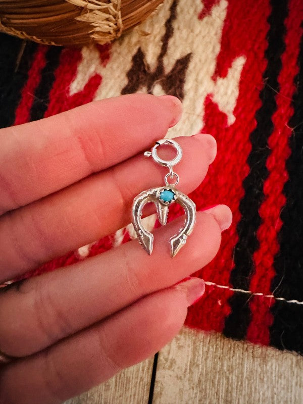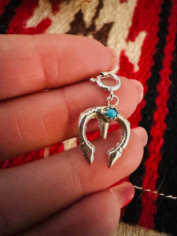 Navajo Crafted Turquoise and Sterling Silver NAja Charm. Measures 1 1/8 inches long by 1/2 of an inch.