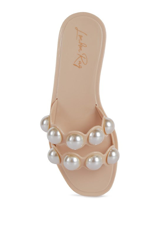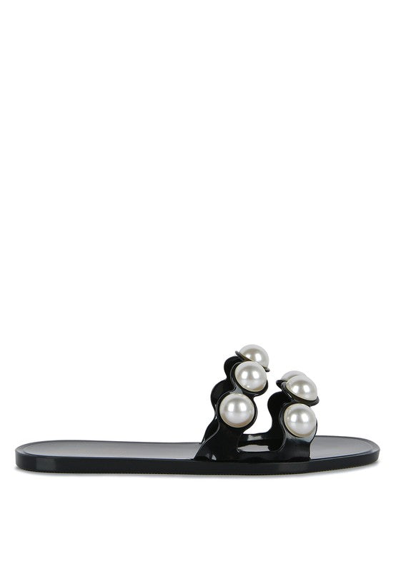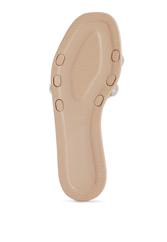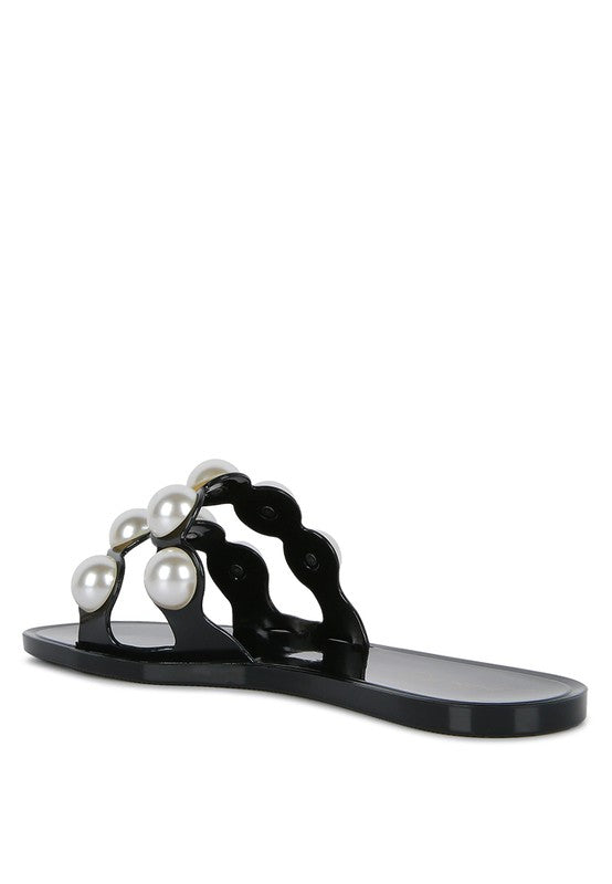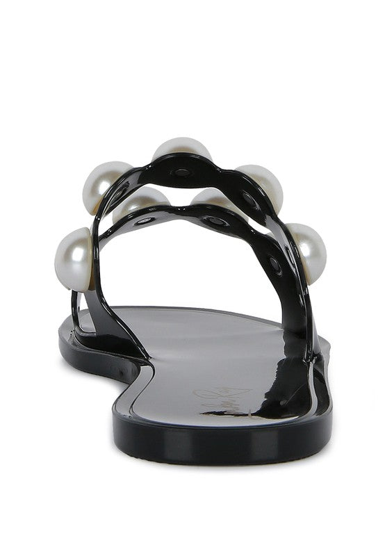 Soft on heels, easy on feet - these jelly flats look gorgeous with oversized faux pearl embellishment on straps. Have grooves outsole which adds to the look. Perfect casual footwear for women on a rainy date!