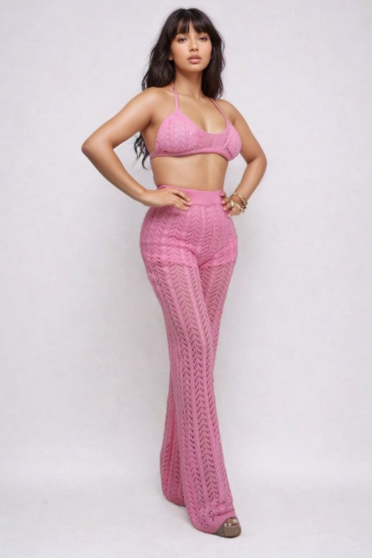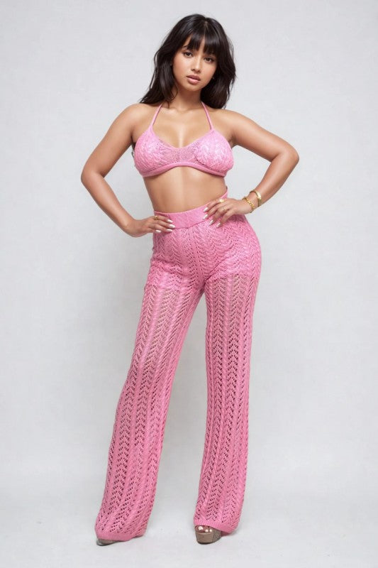 Get ready for sun-soaked days in this adorable pink crochet two-piece set! Featuring a classic triangle halter top with adjustable ties for the perfect fit, paired with matching high-waisted, wide-leg pants. The open-weave crochet design is breezy and perfect for layering over your favorite bikini. Whether you're lounging poolside or heading to a beach bonfire, this set brings playful, feminine vibes.