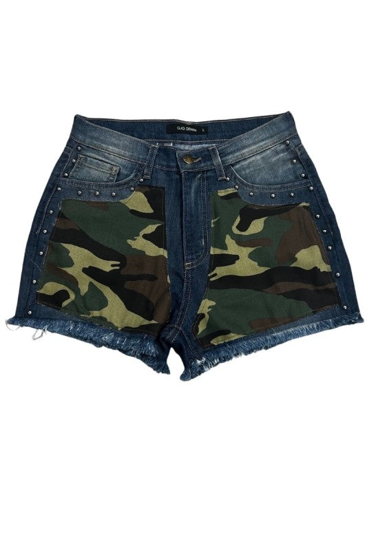 High Rise Denim Short features front and back pockets, front camo fabric panels, frayed hem, Made and Re-worked in the USA