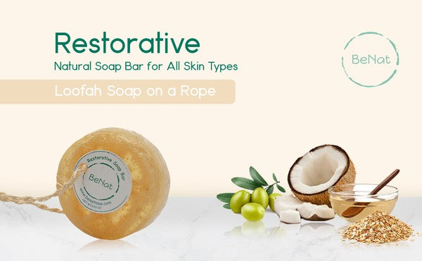 Healthy-looking skin requires the best products in your daily routine. BeNat's Loofah Soap on a rope. Our Artisanal Bar Collection is the best way to cleanse and soothe your face and body. Enriched with natural ingredients like chamomile, chia, honey, wheat, olive, lemon peel, grey clay, green tea, bamboo extract, parsley, oat, coconut, and almond oil.