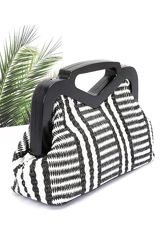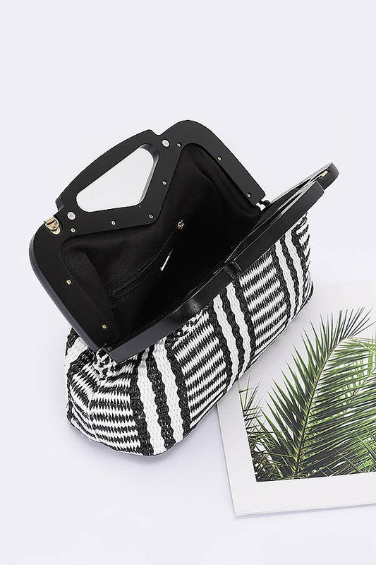 Wooden Frame Faux Straw Top Handle Clutch